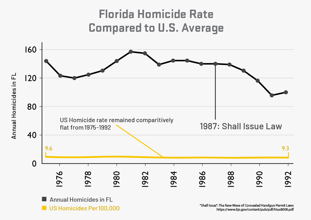 As reported in “Concealed Carry Permit Holders Across the U.S.,” 2018, carry laws appear not to have a noticeable impact on the homicide rate in most states (Florida, perhaps, excepted).